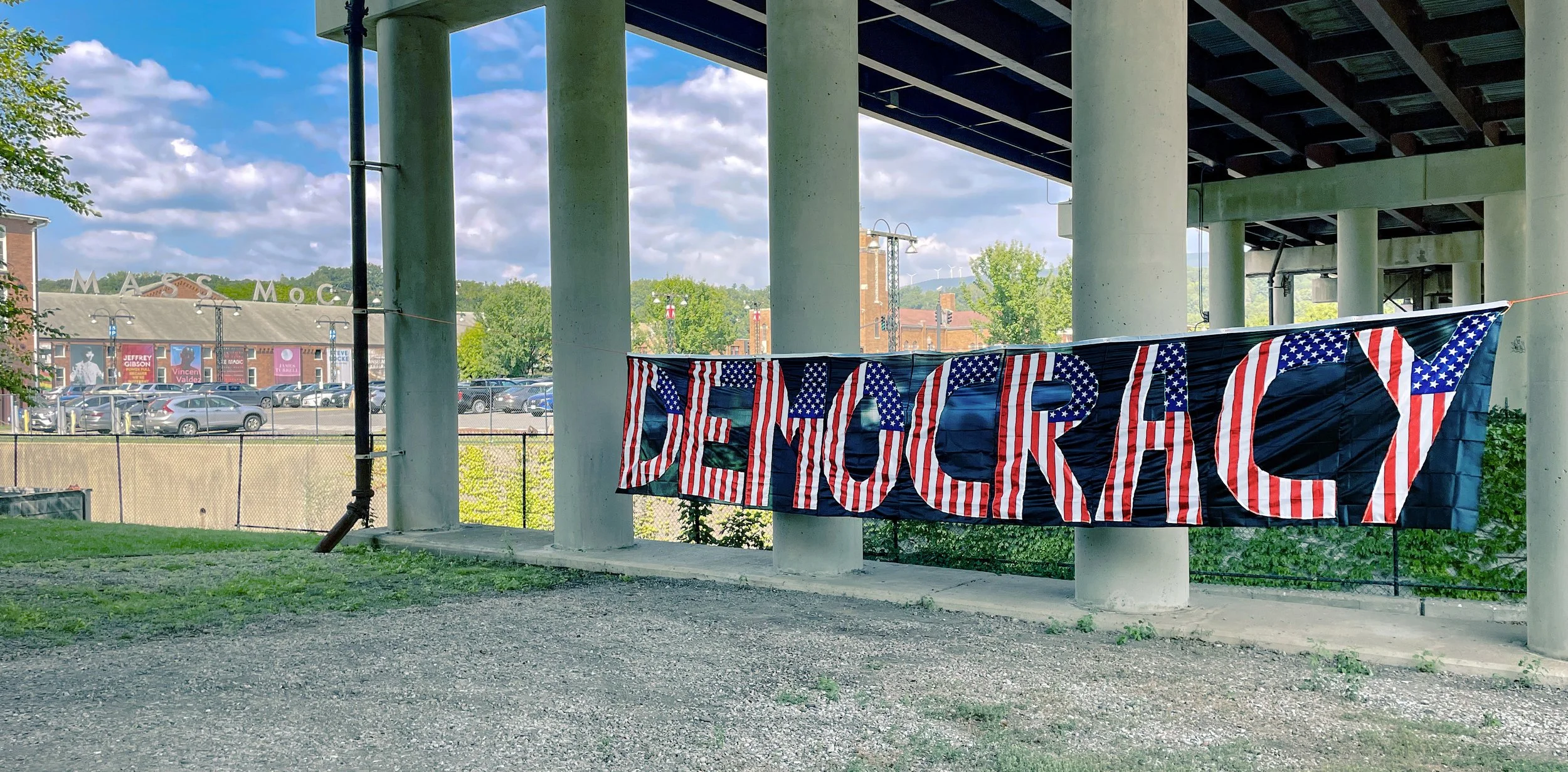 During my MassMoCA Studios residency, I explored scale through textile and flag works. The unfinished piece featured here includes custom print flags with excerpts of the Constitution alongside Lawrence Ferlinghetti’s poem “I Am Waiting.” A partial installation of DEMOCRACY IS A VERB AND SO IS LOVE on campus allowed me to experiment with its impact in a public setting. The residency provided an invaluable opportunity to see how the expansive MassMoCA environment accommodates site-specific, monumental work. This piece affirms what a flag represents both to its people and historically, inviting us to reclaim the symbol as a reminder that the work toward social justice, human and civil rights, and upholding democracy is never done and is a labor of love.