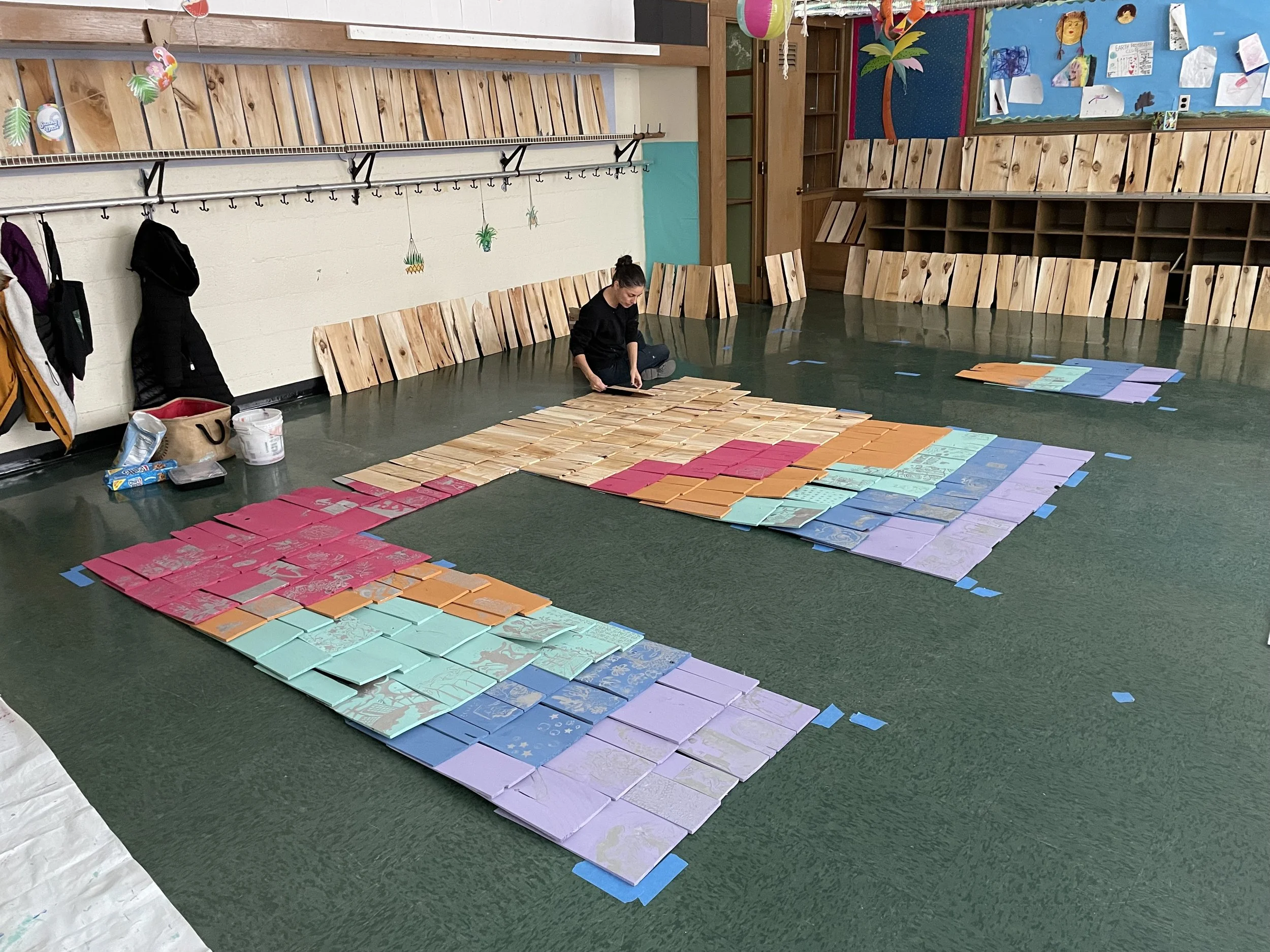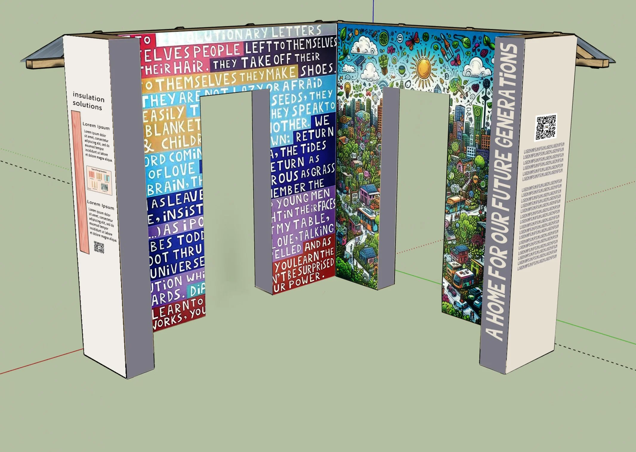 Two 8×8 ft walls hold interior murals on energy conservation, while the exterior becomes a community-made mosaic of painted shingles created in twenty workshops across Framingham and Natick. The shingle wall mosaic features data exemplifying an “Energy Conservation Journey.” The project addresses energy conservation steps in a home, such as installing insulation, window upgrades, heat pumps, efficient appliances, and solar energy to lower carbon emissions. An AR component connects viewers to incentives and expert guidance, empowering and encouraging community action toward a sustainable future.