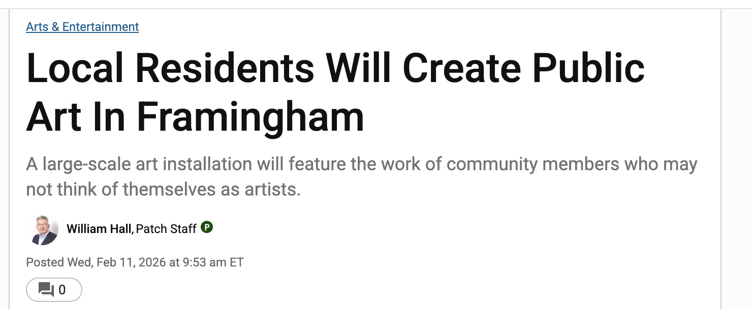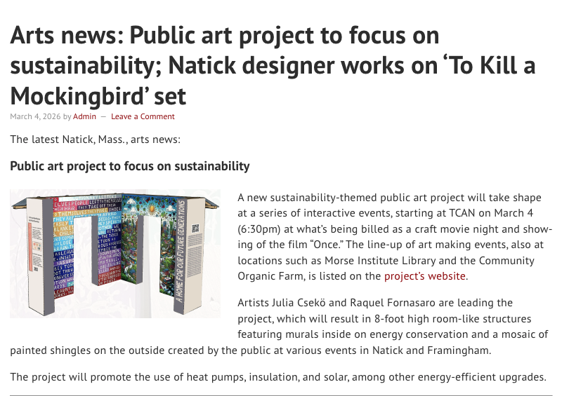 Funded by the sponsors of Mass Save through a Community Education Grant, the City of Framingham and the Town of Natick have invited us to design and lead two complementary, participatory public art projects (one in Framingham and one in Natick) that connect with the theme of Our Energy Future. Our Energy Future is about the role each of us plays in achieving greenhouse gas emission reduction goals in our homes and buildings. This participatory public art project will amplify the importance of collective action towards a more sustainable future.