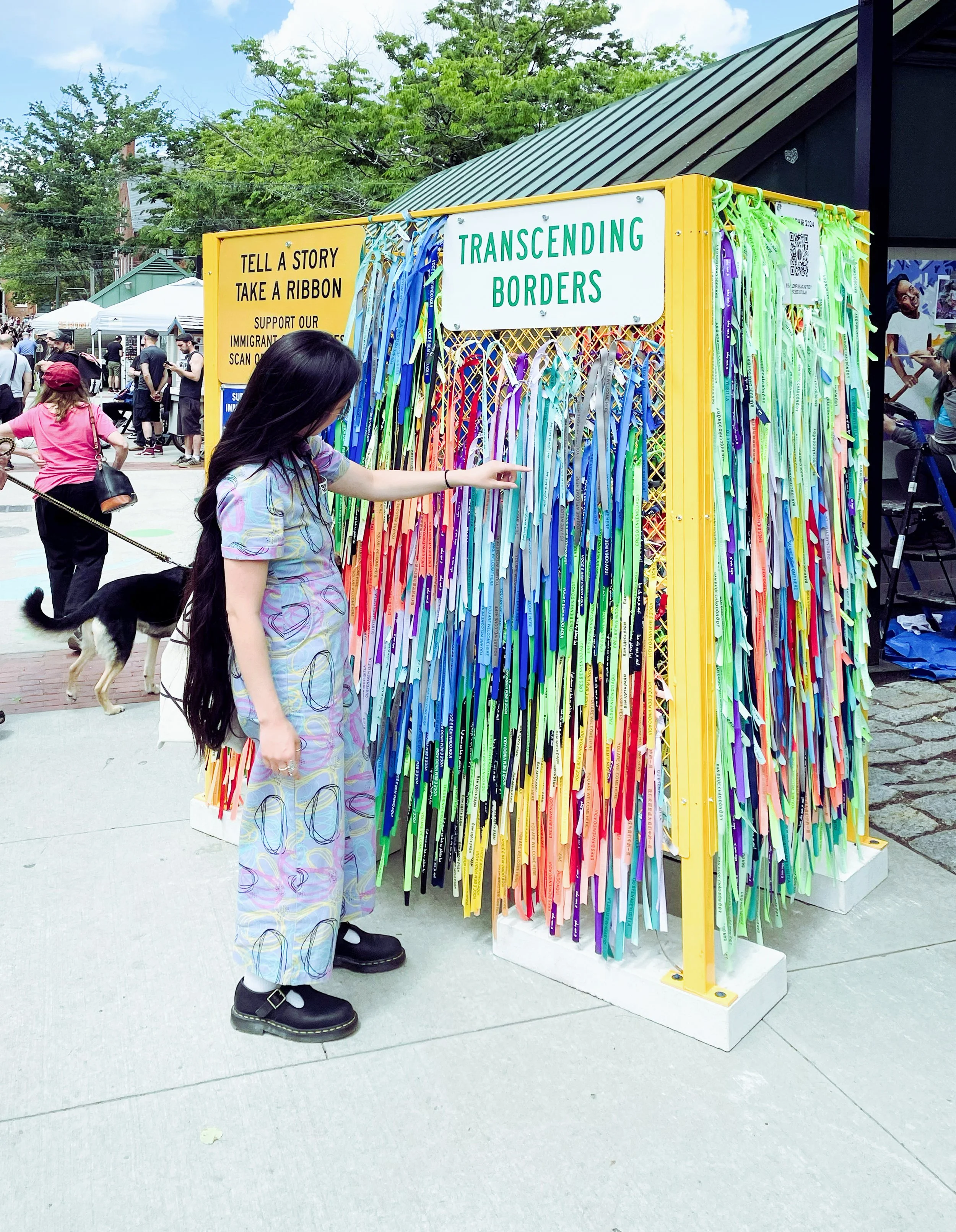This Participatory Public Art piece is inspired by a Brazilian custom, where people of all ages, backgrounds, religious beliefs, and nationalities come to the historical Church of Senhor do Bonfim in Salvador, Bahia, and tie a ribbon representing a wish on the fence surrounding the premises. Transcending Borders features over 2,000 brightly colored ribbons featuring the phrase YOU ARE WELCOME HERE in several languages commonly spoken by immigrant populations of greater Boston. The public is invited to take a ribbon and engage with the piece through a QR code and a mailbox, allowing participants to share stories about immigration. The AR integration leads to organizations that support immigrant and refugee rights.