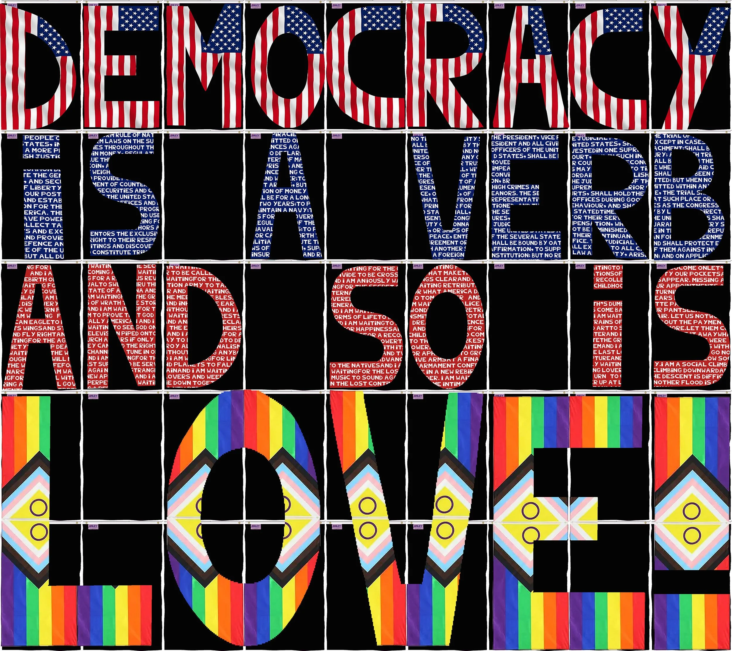 The large-scale sculptural and wearable textile pieces integrate text, raising questions rather than providing answers, inspired by Paulo Freire’s critical pedagogy. Flags are both portable and monumental, soft yet commanding, and historically charged as symbols of identity and protest. Scale plays a significant role in this series, designed to be installed outdoors or within the collective architecture - spaces, such as public buildings, galleries, museums, or on the street. Layering texts of governance, theory, and poetry affirms democracy as ongoing labor and love, while immersing visitors in an environment that is at once celebratory and inviting.