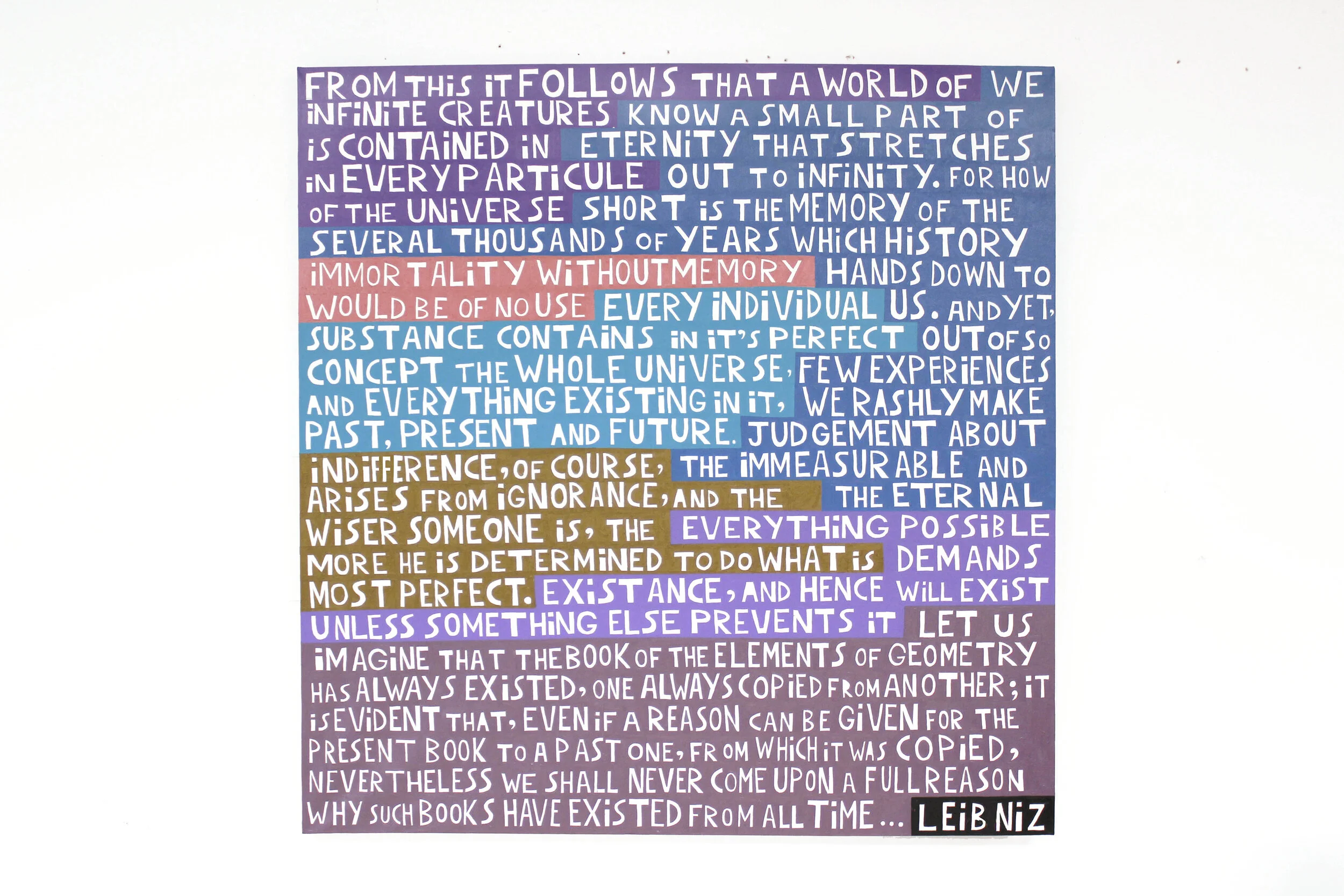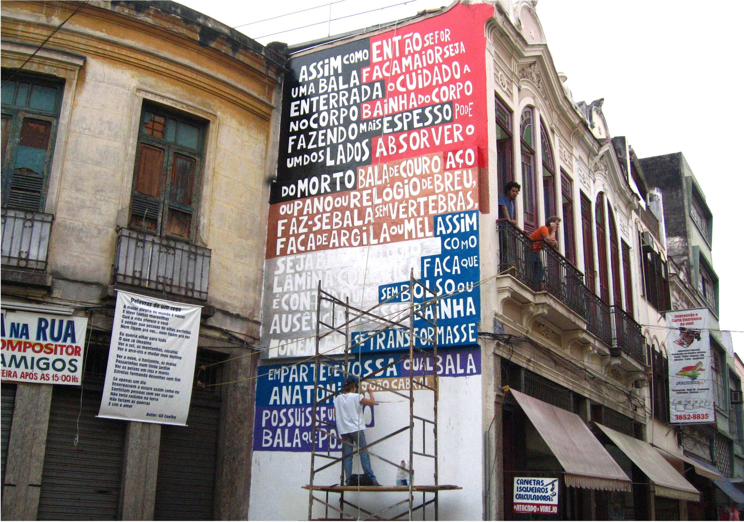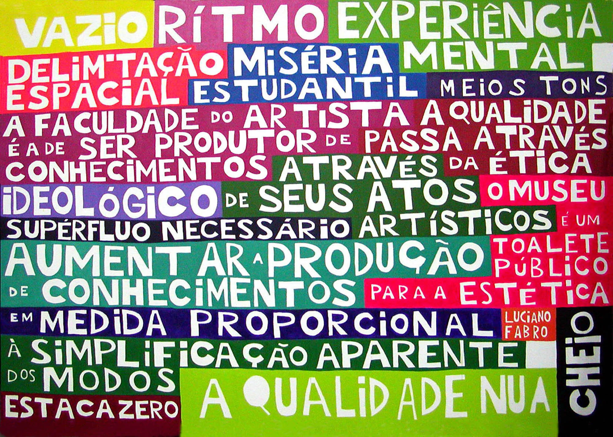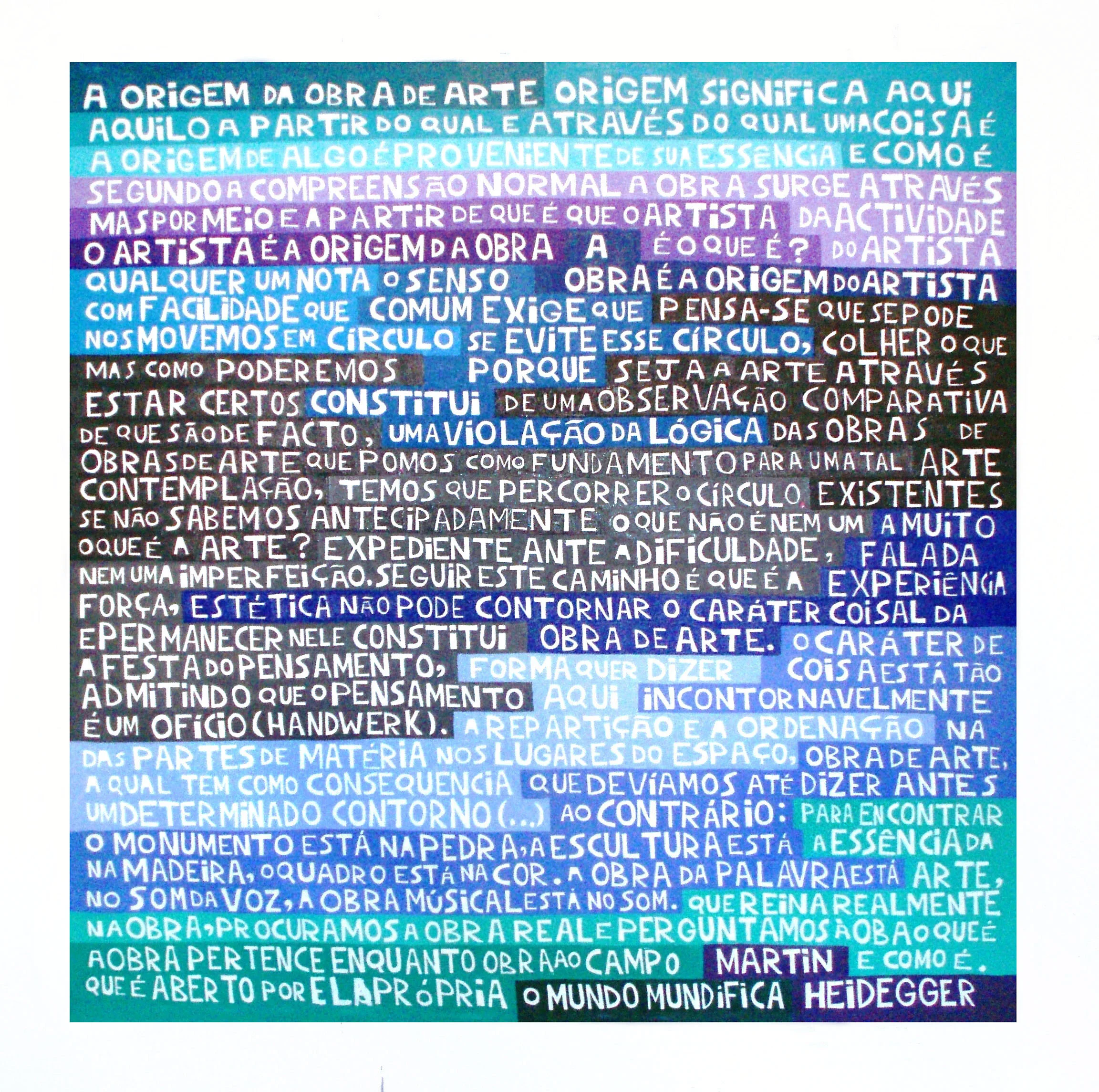 This series began during my BFA at the Federal University of Rio de Janeiro around 2004. The program was highly hands-on, and the theoretical framework did not address the questions I was most interested in, so I turned to my own readings in philosophy and poetry. Wanting to share these ideas beyond the classroom, I began making paintings that presented the work of these authors at a monumental scale, using bright color to draw viewers in.