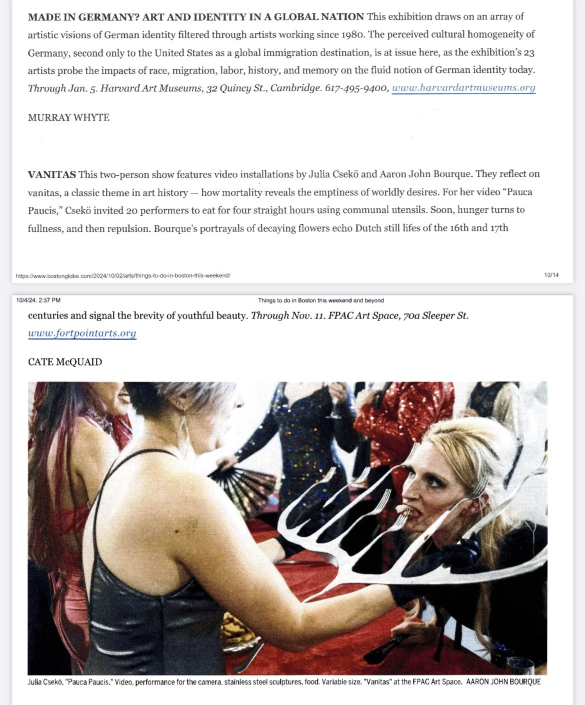 (…)“For her own “Tripas de aço (Guts of Steel),” Csekö has wrapped a table and a child-size chair in skin-tight purple velvet. Bumps under the surface suggest a dish and more, and atop the velvet sits the silverware, which bends and branches out. The fork feeds eight. The artist subverts access to food and dining rituals to unnerving effect.(…)
